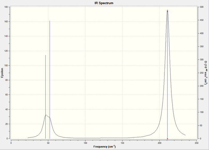 This analysis was performed in the same way, except maintaining the psuedo-potential used to optimise TlBr3. The lowest frequency mode appears at 46.4289 wavenumbers.