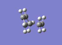 An attempt to find the lowest energy conformer was made by taking antiA (figure 1), chosen due to it being lower in energy than guacheA, and making the bond angles larger to reduce any steric effects. The structure was again optimised to a minimum at the HF/3-21G level. A picture of this molecule is shown in figure 3. The tweaks to the structure made little difference, but was very slightly lower, the new molecule having an energy of -231.69260237 a.u..