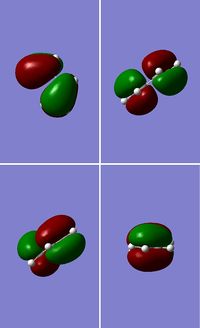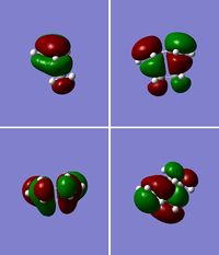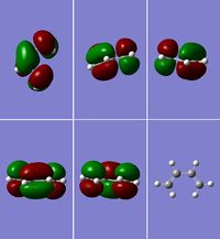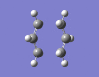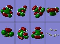 A molecule of cis-butadiene was drawn out, cleaned and optimised using the AM1 semi-empirical method, giving a molecule of energy 0.04878534 a.u. The HOMO and LUMO were visulalised, and can be seen in figures 13 and 14 respectively. The pictures in the first row of both figures cleary show the nodal planes of the two MOs, the HOMO having 2 and the LUMO having 3. The HOMO is clearly antisymmetric, whereas the LUMO is symmetric.