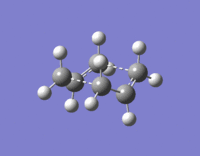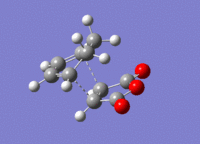 An allyl fragment C3H5 was optimised to the HF/3-21G level of theory, giving a molecule of energy -115.82304010 a.u., which can be seen in figure 5 and who's log file can be found here. Using 2 units of this fragment, a chair transition state was guessed and optimised to a transition state using TSBerny to the HF/3-21G level of theory (chair optimisation A). This gave rise to a structure with an imaginary vibration of -817.9cm-1 and energy of -231.61932230 a.u.. This imaginary vibration can be seen in figure 6, and it's log file can be found here. After this optimisation the bond making/breaking distances had dropped to 2.02Å.