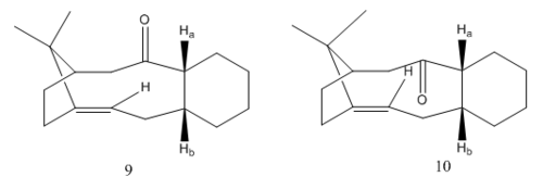 Upon further minimization, derivatives of the intermediates which had a lower energy were modelled when the Ha and Hb are trans to each other with the Ha pointing in the opposite direction to the carbonyl. A derivative for isomer 9 was modelled to have an energy of 60.65 kcal/mol and that of isomer 10 was 65.68 kcal/mol. This derivative of isomer 9 is useful as it is has a lower energy than the other isomers of 9 and could be useful in reactions that require the stereochemistry of the carbonyl to be pointing upwards. It is also worth noting that when carbonyl up and hydrogen are pointing upwards, that conformation is ~4kcal/mol lower than when all carbonyl and hydrogen are pointing downwards. This is due to the repulsion from the cyclopentene ring which is folded downwards and it subjected to more repulsion when the carbonyl and hydrogen are pointing in the same direction.