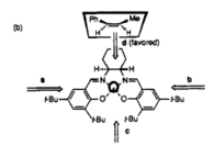 When a tert-butyl group is substituted para to the salen-oxygen, a side-on attack is unfavourable due to steric clash. Approach from the ortho-tBu face (approach c) is also hindered as it possesses a favourable attractive interaction and is unlikely to disrupt its geometry as it is distance dependant. [9] The side syn to the cyclohexane ring (approach b) is more disfavoured due to the additional steric hindrance from the ring and the bulky tert-butyl group. Therefore, the most favourable mode of approach is the top face which makes the Jacobsen catalyst an excellent catalyst for the cis-selective epoxidation of alkenes.[9]