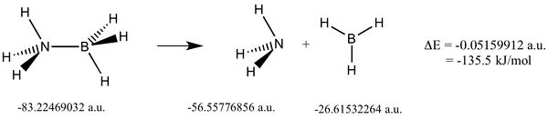 Lit. value for bond = 130kJ/mol.[11] The negative change in energy indicates that relative to the dimer the two seperate moleculers of Ammonia and Borane is a more stable configuration.