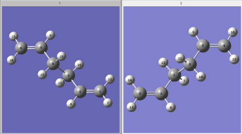 The [3,3] Cope Rearrangement has been the subject of much discussion relating to the transition state of the reaction. It is now widely agreed that it occurs in a concerted fashion via a 'chair' or 'boat' transition structure. In the following exercise we will study the low energy minima and transition structures of 1,5-hexadiene and subsequently determine the preferred mechanism. The rearrangement is depicted below: