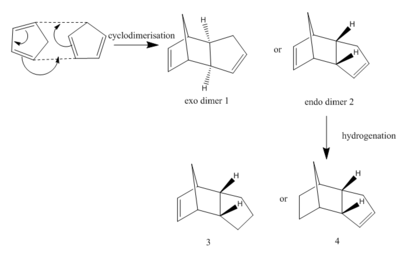 At room temperature, cyclodimerisation occurs between two cyclopentadienes to produce either exo dimer 1 or endo dimer 2. Cyclopentadiene dimerises to produce only endo dimer 2. The objective is to figure out whether this reaction is controlled kinetically or thermodynamically by calculation of the geometries and energies of the two dimers. The structures of dimer 1 and 2 have drawn by Chemdraw 3D and their geometries were optimized by Avogadro under MMFF94(s) force field option; as well as the bond stretching, angle bending, torsional, out-of-plane, van der waals and electrostatic energies. The results are shown below in the table 1 and further analyzed later.