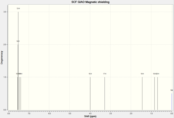It was drawn by Chemdraw shown in figure on the right and optimized to the minimum energy by Avogadro under the MMFF94s force field. Then, in order to calculate the geometry at the density functional level (DFT), Gaussian was used to generate the NMR spectra for both 1H and 13C, and TMS B3LYP/6-31G(d,p) Chloroform was selected to perform 1H and 13C NMR spectra. In addition, all chemical shifts have been rounded to four decimal places.