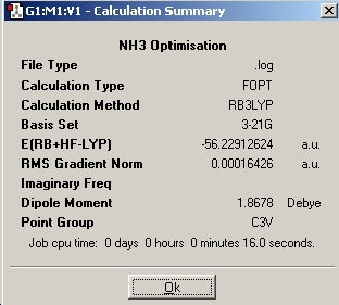 In this part of the report we will be performing a similar range of calculations on the isomers of ammonia. The aim is to investigate the effect of symmetry on the structures, their energies, and the relative optimisation times. During the first optimisation, a molecule of NH3 was generated in Gaussview, and the basis set used was 6-31G and the method used was B3LYP. Then another molecule of NH3 was created and one bond was set to a length of 1.01Å, and the ignore symmetry option was invoked. FInally the nh3_b3lyp_d3h.txt provided was opened and an optimisation run. This file included a dummy atom which restricted the symmetry of the molecule.