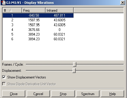 As can be seen from the above results, in the case of the C3v structure all of the frequencies are positive, this tells us that we have the minimised structure. Compared with the D3h structure which has one negative frequency (-840.58). This tells us that thi structure is a transition state. When we examine the table of the vibrational modes, we can see that all of the vibrational modes match up to one another. We can also see that vibrational mode 1 follows the inversion pathway.