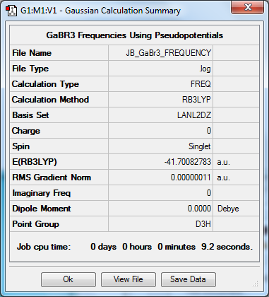 In GaBr3 however, the frequencies range from 76cm-1 to 316cm-1, which is a range of much lower values. This is due to the fact that the reduced mass value has increased significantly and so even if the force constant/bond strength was stronger, it has not compensated enough to maintain the frequency values. The fact that the frequency is only 1/10th to 1/3rd of the value rather than even less suggests that the force contant - and thus the bond strength - has increased slightly; this is backed up by the molecular energy values from the respective optimisations.