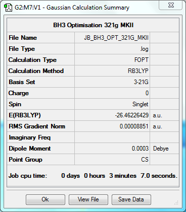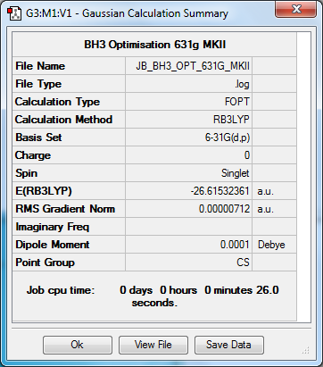 Where "k" is the force constant and "μ" is the reduced mass of the molecule. The frequencies of the BH3 modes range from 1163cm-1 to 2582cm-1; the face that the reduced mass of the molecule will be very small suggests that the force constant and so the bond strength of the B-H bond is very stron - in line with what teh calculated data has indicated.