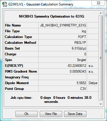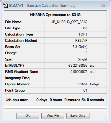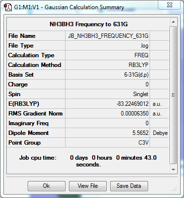 By taking the molecule energies from BH₃ and NH₃ and comparing them to that of BH₃NH₃, it is possible to compute the estimated energy for the B-N bond. This dative covalent bond is expected to be of medium strength, and indeed when calculated, the number is 140KJ/mol (to the nearest 10kj/mol; the approximate accuracy of the Gaussian calculation). This figure is actually slightly larger than what has been measured elsewhere, but it is roughly what would be expected for a bond of this strength. It is worth noting that because the basis set used isn’t perfect, the figure will inherently be slightly off the true value.
