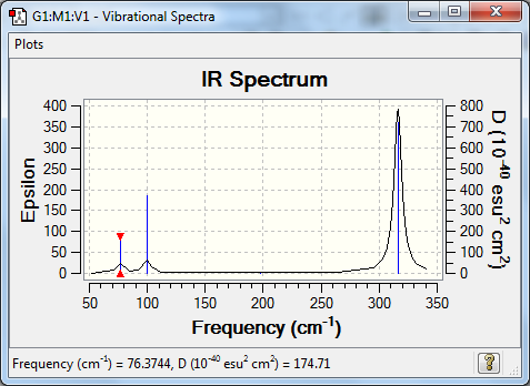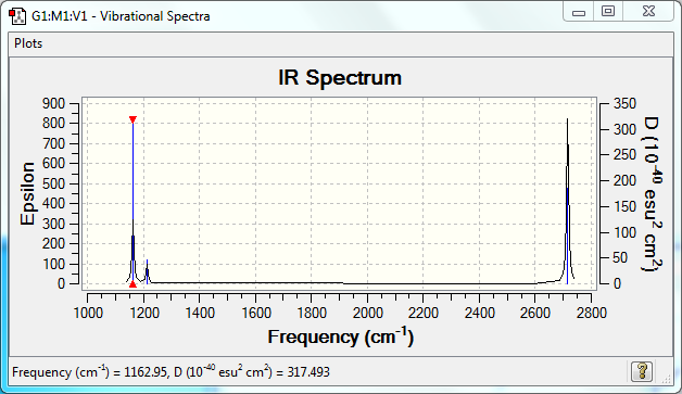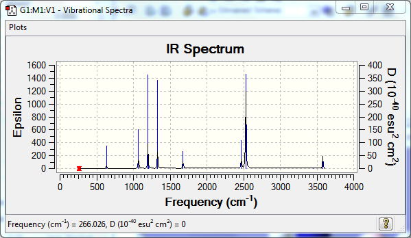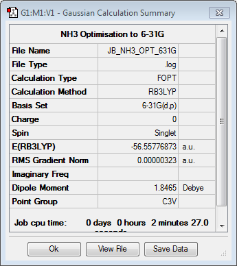On this page, for each optimisation, a table with a summary of the optimisation, the confirmation from the .log file that the molecule has been optimised and a jmol image is presented as raw data. For each frequency calculation, a table with the calculation summary and the list of low frequecies is presented, followed by a table of vibrations and the calculated spectrum itself.