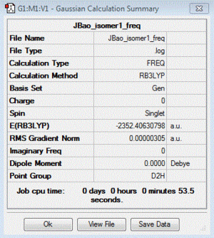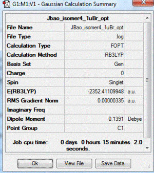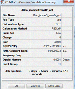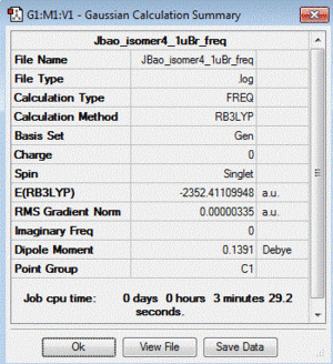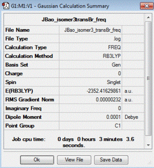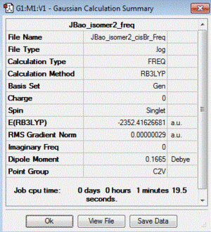 After imposing point group symmetry on the isomers, frequency calculation were carried out using the same method B3LYP , basis set 6-31G(d,p) for Al, Cl and pseudo-potential LanL2DZ for Br. This confirmed that minima found from optimisation calculation were genuine as the energies were almost identical with low frequencies lines within ±15cm-1 and no negative frequencies.