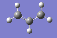In the diagram above it can be seen that both transition structures progress with bond breaking/forming occurring inbetween two allyl fragments (CH2CHCH2). To model the transition structures this fragment must first be optimised. The fragment was optimised using HF/3-21G level of theory (which shall be applied throughout the transition state optimisations), which yielded the following structure.