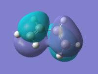 Initially the semi-empirical AM1 method was used to optimise the structure of cis-butadiene. At first the structure of cis-butadiene was drawn planar with the dihedral angle C1-C4 = 0o. The structure was optimised and this gave the negative frequency. The imaginary frequency shows the molecule twisting as to lose it planar structure. The molecule was then re-optimised with the C1-C4 dihedral angle set to ~20o. At this point the method was switched from the AM1 method to B3LYP/6-31G* level of theory to get a more accurate result for the optimisation and molecular orbitals. The same process was then repeated for the ethylene molecule.