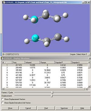 As both the boat and chair transition states contain two C3H5 allyl fragments, both fragments were optimised separately and incorporated into one window, then two different techniques were employed to optimise the overall chair transition state. The first technique involved approximating inter fragment distance and from here estimating the Hessian, or force constant matrix. The optimisation was performed to a transition state (TS(Berny)) as we are attempting to find the energy maximum on the PES which correlates to transition state, and under the Hartree-Fock method and 3-21G basis set. Transition state molecular dynamics tells that a frequency or forbidden vibration should occur at a negative which relates to the vibration between the two transition fragments. As a result, 'Opt=NoEigen' was included in the calculation as it relates to no eigenvalue, which prevents the calculation from ceasing if more than one imaginary or 'forbidden' frequency is found.