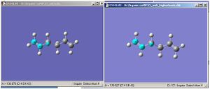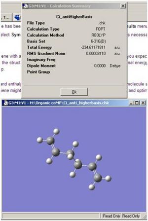 It is suspected that the lowest energy conformation would be the anti conformation, as this arrangement seems to have the most conformers wherein the alkene groups are furthest away. Both structures above are tabulated in Appendix 1. The gauche conformer above relates to the gauche6 conformer in Appendix 1, and there is perfect accuracy. However the anti conformer above, which relates to anti4, does show deviation from the energy value in the appendix, by 0.0134 hartree.
