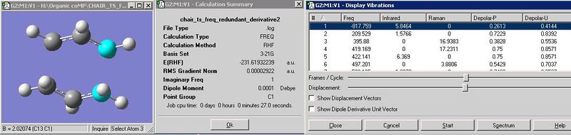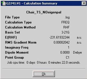 However, eventually, after increasing the number of optimisation cycles (maxcycle=N) the correct optimisation was gained as shown. The frequencies were also calculated and given that there is an imaginary vibration in line with the literature value (-817.1cm-1), it is a fair estimate of the chair transition state given the basis set level.