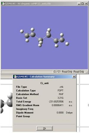 The molecule was redrawn however this time with a gauche linkage for the four central atoms. Again the structure was optimised using the using the Hartree-Fock method and the 3-21G basis set. It was expected that the gauche conformation would be higher in energy than the anti as the torsion angle between the two substituent carbon chains is 60˚, much closer than the anti arrangement, and therefore increased steric interaction would result. The optimised structure is shown below, along with the summary which displays the energy as -231.68916020 hartrees. This is lower than the previous ani conformer, and which correlates with the previous prediction.