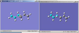 The C=C bond distance for the 3-21G basis set was 1.31627A whereas the same distance was 1.33349A under the B3LYP set. This perhaps relates to the idea that the earlier basis set does not accurately follow the first derivative of the PES, in that although it is near an energy minimum the limitation of the method settles for any point within a respectable range of the minimum; meaning that the optimised structure is at very close to a energetic and geometric minimum but notquite on thevery specific point. The more advanced set, does not have such a great minimum and so optimises even closer to the energetic and geometric minimum, i.e where the second derivative is postive.