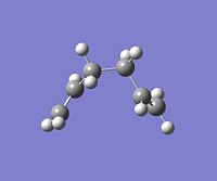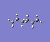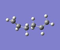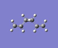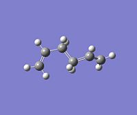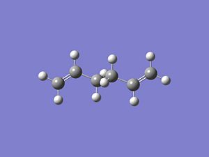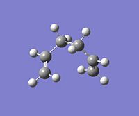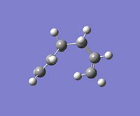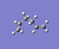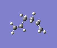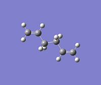 Using GaussView, a moleucle of 1,5-hexadiene was drawn with an "anti" linkage, whereby all the bonds are trans to each other. The structure was first cleaned using the option in the toolbar of GaussView and then optimised at the HF (Hartree Fock)/3-21G level. The resulting energy of the optimization was -231.68540 a.u., with the symmetry of the molecule being assigned to the C2h point group.DOI:10042/to-4702 . From Appendix 1[1], this conformer was assigned to be "anti-3". All of the other conformations were then found and optimised using the same method and basis set. NB: Relative energies were calculated in kcal/mol by the conversion factor of 1 Hartree = 627.51 kcal/mol