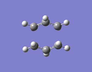 The transition state structure can also be optimised using a frozen co-ordinate method. The guess structure for the "chair" transition stae was used again but instead of doing a normal optimisation, the redundant co-ordinate editor was used. The redundant co-ordinate editor aloows us to fix the distances between the terminal carbons which are involved in the transition state bond making process. Bonds between terminal carbons were set to be 2.2A and a normal calculation was set up using the HF/3-21G level of theory DOI:10042/to-4715 . The resulting .chk file was accessed after the calculation had finished and these bond lengths had been optimised to approximately 2.2A. The redundant method was used again to optimise the structure that has just been optimised. The two sets of bond forming/breaking carbons were set to derivatives with the same calculation set up. This time the force constants were not calculated DOI:10042/to-4716 . Comparing this further optimised structure to the HF/3-21G optimised chair structure, the main difference is the symmetry of both structures. The HF/3-21G structure has a point group of C2h and this is reduced to Ci in the redundant co-ordinate editor method. The bond lengths between termianl carbons is approximately the same at around 2.02A with the energy of the system also remaining constant at -231.61932 a.u. This shows that both methods can allow us to assess the energetics of the system in question but they have contrasting results concerning the overall symmetry of the system.