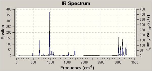 The energies given in the output filees for each optimisation represent the energy of the conformer on a bar potential energy surface. To compare experimentally measured quantities, more terms in the calculation must be included. A frequency calculation will be undertaken with the ouput of this calculation being used to characterise critical points within the transition state structure i.e. to confirm that it is a minimum in this case: that all vibrational frequencies are real and positive. The frequency calculations were run at the same level of theory as the higher optimisation of the "anti-2" strucure - DFT B3LYP/6-31G method . For the "anti-2" structure, the frequency analysis was undertaken which resulted in no imaginary frequencies of vibration being calculated DOI:10042/to-4719 . This shows that a valid minimum has been found. The resulting IR spectrum is shown below, with the three most intense vibrations animated:
