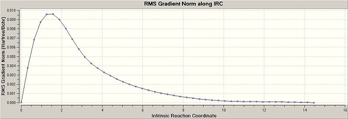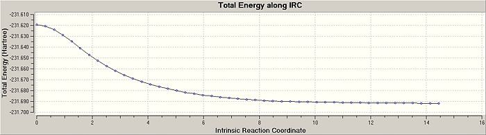 The "boat" and "chair" transition states have been succesfully found but we do not know which one the reaction proceeds through. The intrinsic reaction co-ordinate (IRC) creates a series of points by taking small geometry steps in the direction where the energy gradient is steepest. The IRC calculation will be performed on both transition state structures, calculating the force consants once. The IRC was only computed in the forward direction to the symmetrical nature of the reaction. The higher level optimisation of the "chair" structure was taken (DFT B3LYP/6-31G) and the IRC calculation was set up calculating the force consatnts once. From the results, the molecule hasn't reached a minimum geometry so the calulcation procedure can be changed in the followung three ways to enahnce the minimsation.