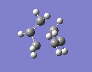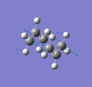 Theoretically, the chair and boat structures of the transition states consist of two C3H5 allyl fragments. Therefore, two fragments will be used to model these transition states. and will be placed approximately 2.2A apart from each other in the desired conformation. The chair transition structure has C2h symmetry whereas the boat structure has C2v symmetry. A C3H5 fragment was drawn into GaussView and optimised using HF/3-21G level of theroy which resulted in the fragment being optimised to an energy of -115.82304 a.u DOI:10042/to-4711 . This optimised structure was then copied into a new window to give two optimised C3H5 allyl fragments. These optimised fragments were then arranged into a chair like transition state with the central carbon of each fragment pointing in opposite directions making sure the distance between each terminal carbon of oposite fragments being approximately equal to 2.2A. In general, transition state optimisations are more difficult to undertake than minimizations because the calculation needs to be where the negative direction of the reaction co-ordinate is, otherwise the incorrect structure could be located. With a reasonable guess of the transtion state, the force constants for the optimisation process can be computed. With the computation of these force constants, GaussView can easily identify whether it is moving in the correct direction to locate the correct optimised transition state structure. With the two fragments being arranged in a chair like transition structure, they were optimised at the HF/3-21G level of theory with accompanying frequency calculations (Opt+Freq). This time the optimisation was not to a minimum structure but a TS(Berry) which can be selected as an option in Gaussview. The optimisation resulted in the transition state shown below, with the frequency output only showing one imaginary frequency of -817.93cm-1DOI:10042/to-4714 . The imaginary frequency and transition state structure obtained are consistent with those shown in Appendix 2 [3]. The vibration is also animated below.