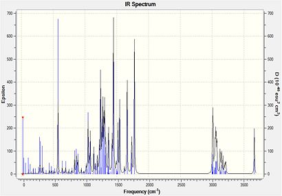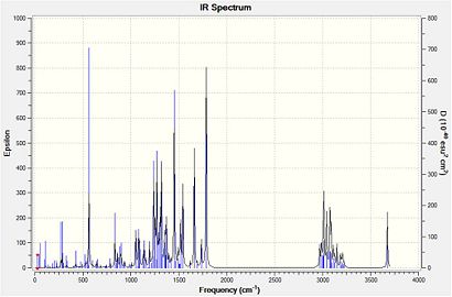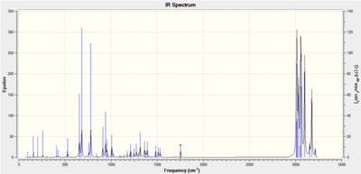 All of the key infrared absorptions expected in each compound have are observed in the computed spectrum. In general, each peak is within approximately 5cm-1 of the literature value. Upon further analysis of the output file, it was also learned that both the asymmetric and symmetric =C-H absortpions for each compound can be resolved using this technique as each absorption has a medium intensity. However, as this method produces the infrared spectrum of the compound in the gas phase, it does not account for the strong intermolecular hydrogen-bonding interactions which take place in when completing the spectrum using solid product on a KBr plate. For both compounds, the literature reports an absorption at approximately 3340cm-1 which is consistent with intermolecular hydrogen bonding occurring. But the spectra produced using Gaussian has an absorption at about 3670cm-1 which represents a free O-H bond. The characteristic absorption of a di-substituted aryl ring in the region (1700-1900cm-1) is not observed for either compound using this method. As both compounds have extremely similar bonds, certain identification of either compound using this spectroscopic method is extremely difficult, but it does provide a useful indication of the functional groups present in each product.
