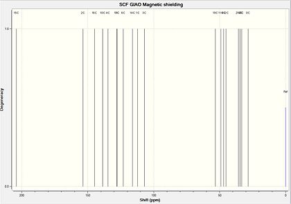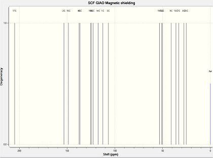 As the spectrum produced labels the number of each carbon atom causing a particular peak, compounds 19 and 20 can be identified using this computational method, which is more difficult using standard NMR spectroscopy. The key atoms involved in compound identification for both structures are atoms 15 and 17. In compound 19, atom 17 is doubly bonded to oxygen and is therefore is the most deshielded, having a chemical shift of 205ppm, whereas in compound 20 this atom is doubly bonded to carbon and has a chemical shift of 128ppm. Furthermore, in compound 20, atom 15 is doubly bonded to oxygen and is therefore is the most deshielded, having a chemical shift of 204ppm, whereas in compound 19 this labelled atom is doubly bonded to carbon and has a chemical shift of 125ppm. This highlights the value of computational methods to clearly indicate the different chemical environments of specific carbon atoms in each compound. Isotopic labelling of carbon atoms in this region of the diketone with 13C would also enable each compound to be more easily identified.