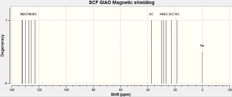 From this it is clear that most of the chemical shifts are slightly lower than found in the literature, with the mean difference being -1.5 ppm and the values having a standard deviation of 2.8 ppm from this. As such, the computational method has reproduced the 13C NMR spectrum rather accurately. The only cause for concern is the resolution of peaks 9 and 10, which are shown as degenerate in the calculations but are clearly different from each other in the literature.
