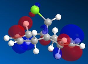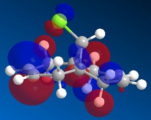 Another reason for the stability of the exo alkene to electrophilic addition is that, as can be seen, the LUMO has a favourable overlap with the electron density over the exo alkene on the HOMO-1 orbital. This corresponds to donation from the exo C=C π-orbital (HOMO-1) to the anti-periplanar C-Cl σ*-orbital (LUMO+1). This serves to stabilise the HOMO-1 orbital, making it too low in energy to be react with most electrophiles. It has been recorded that this stabilises the exo alkene by 0.08 eV[6] with respect to the endo alkene. As well as strengthening the exo C=C bond, donation into the C-Cl σ*-orbital increases the anti-bonding character of the C-Cl bond, thus weakening it.