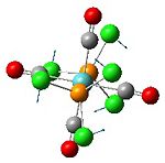 Thus, the dihedral angles between the chlorine atoms and the carbonyl groups were altered. For the cis isomer on PCl3 group was set so that there was a dihedral angle of 0o between one of the chlorine atoms and a CO group, whilst the other PCl3 group was set so there was an angle of 180o to this same CO group. For the trans isomer, both PCl3 groups were set to eclipse each other, and have a dihedral angle of 0o between one chlorine atom and a CO group. The calculations were then carried out again using the more accurate LANL2DZ basis-set. This gave the geometries below: