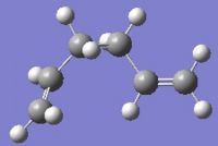 This was tested by starting from a gauche conformation with both alkene groups pointing in the same direction, but not too close together. This was then optimised using the HFT/3-21G level of theory. The resulting structure is shown below, having C1 symmetry and a total energy of -231.69266 a.u.. As this is the lowest energy conformation of 1,5-hexadiene, the relative energy of each conformation can be found with the energy of this conformation as the reference. These have been shown in the table above.