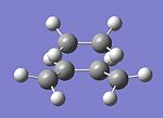 However, this failed to find the boat transition state, instead once again finding a chair shaped structure with bonds between the termini. For the QST2 method to work, the orientations of the reactant and product must be altered to resemble the boat structure more closely. This was done by changing the C(2)-C(3)-C(4)-C(5) angle to 100o in both molecules. The optimisation and frequency analysis was then carried out once again. This delivered the transition state below: