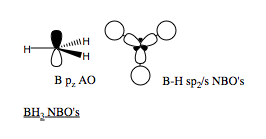 We can also read off the hybridisation of each bond. All three B-H bonds are of equal length, and are all of sp2 hybridised B (1s and 2p) and 1s H. Therefore, as we expect from the MO analysis, and the Lewis acidity, we can conclude that the B centre has an empty pz orbital, explaining the planar structure and three bond angles of 120o. The NBO picture of the molecule is shown.