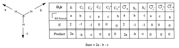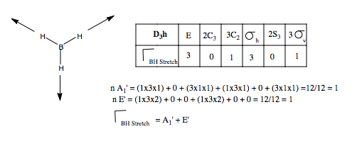 We are now going to predict the number and form of the vibrational modes of BH3, from group theory, much as we did for the molecular orbitals above. First, we need to form a basis set, comprising of displacement vectors describing the vibrations, and see how these transform under the symmetry operations of the point group. This gives us the reducible representation. Then we find the contributing irreducible representations using the reduction formula. Finally, we find the form of the vibration, and whether or not they are IR active, using the projection operator, or in a simple system like this, guess.