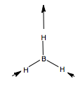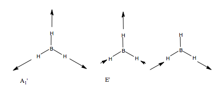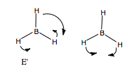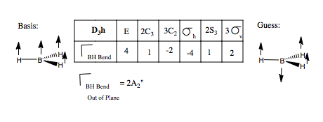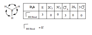We can carry out the same analysis for bending modes. This time, we place curved vectors between the bonds, allowing the bonds to rock back and form in plane These we would expect to be at a lower frequency than the stretching modes. We form the reducible representation, and find the contributing irreducible representations. Only one doubly degenerate mode contributes to the in place BH bending. Using the logic we used above, we can guess the form of the vibrations by reference to the H3 SAO e' orbital set. Thus, we form our guess: