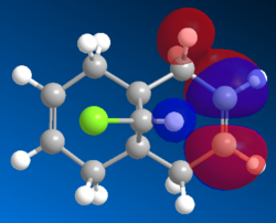 Looking at the lower energy and less reactive HOMO-1, the electron density are shown to be more heavily localised on the exo alkene. This stabilisation can be explain by the interaction between the σ* C-Cl and the π orbital of the exo alkene. This donation from π orbital into the σ* C-Cl is supported by the LUMO+2 (in Gaussian).