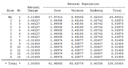 The data shown in the table above represent the charges distributions and the electrons populations within the complexes. While both complexes have almost the same valance populations (around 65.6), the distributions were quit different; The electrons are more localized at the metal centre for the Mn complex (around 6.9), whereas in the Ti complex, a lower populations are observed at the metal centre (only around 4.3). The valance populations of C and O are around 0.15 and 0.28 higher respectively in Ti than Mn complex. This indicate a migration of electron density from the metal centre to the CO as you move from the Mn complex to the Ti complex, suggesting a stronger back-bonding in Ti complex.