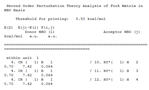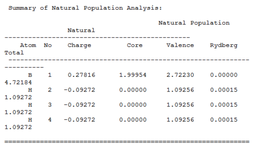 The neutral charges shown in the table are the same as the number shown in the molecule, and the sum of all the charges is zero. The natural populations represent the electrons "population"; the numbers under valance indicate the valance electrons and core the non-valance electrons. From the table, it is clear that the valance electrons in B are less than 3 and valance electron in all three hydrogens are greater than 1. This result is in good agreement with our understanding of this molecule; An overall neutral molecule with the Lewis acidic and slightly more electron-positive Boron atom being the more positive atom as the electrons are slightly drawn toward the hydrogens atoms (which are more electron-negative).