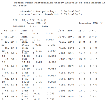 The NBO analysis was carried out along with the MOs analysis, the results are viewed by opening the resulting .log file in notepad. There are many many data within this file, however, the part that is most relevant to this project is the second order perturbation table, as it can be used to show the back-bonding interactions. There is a huge amount of interactions, the ones that represent back bondings (interaction between the metal lone pair and anti-bonding orbitals of CO) are shown below: