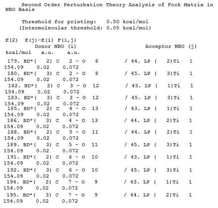 As shown in above data, there are significant interaction between metal lp and BD* of CO, there are six CO, can be distinguished by carbon numbers C2 to C7 (the C2 = carbonyl with Carbon atom 2, C7 is carbon atom 7, etc). The extend of this interaction can be view in the E(2) kcal/mol column; for each complex, all the interactions (C2 to C7) are the same as all CO are identical in chemical environment. However, the interactions are much stronger in Ti complex than in the Mn complex, 154 kcal/mol vs 14 kcal/mol, the E (2) values in Ti complex are more than ten times bigger. This is further support the idea that a higher electron density on the metal centre give rise to a stronger back-bonding.