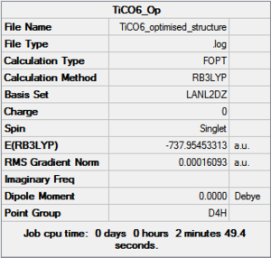 MnCO6 and TiCO6 were drew in gaussview and optimized using LANL2DZ, xxx. The optimized structures were then used for frequencies calculations. This is important as the IR spectrum is a very good indicator on the accuracy of the calculations, and how close the calculation is compared to experimental data. The expected CO stretching frequencies are around 2090cm-1 for MnCO6+, and 1800cm-1 TiCO62-. For simplicity, the charges are removed and neutral complexes are used instead.