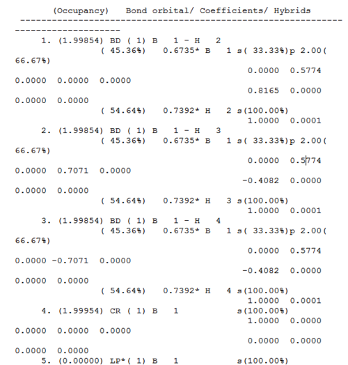 First Bonding B (atom 1) to H (atom 2), the bond consist of 45.36% B (33.33% s + 66.67% p, suggesting sp2 hybridized) and 54.64% H. Same bondings apply to the other two hydrognes, as shown above, all three bonds shared the exact same compositions.