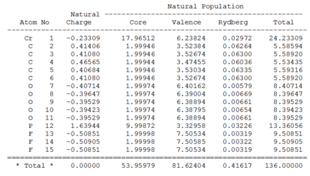 Again, looking at the valance column above, not a significant difference, but still a slightly higher value at the Cr for X=F complex, supporting the idea that the electrons are less donated into the CO. Similar trend was also observed in Second Order Perturbation Theory Analysis of Fock Matrix in NBO Basis analysis, however, the extend of the interactions are smaller than those found in the MnCO6+ and TiCO62- complexes.