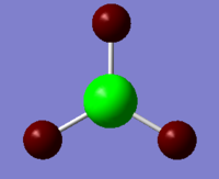 The point group of the TlBr3 was restricted to D3h and the model then optimised using the B3LYP calculation method and LanL2DZ as the pseudopotential basis set. The structure was restricted and a medium level basis set was used to speed up and simplify calculations. The summary table shows TlBr3 has an energy of -91.2 Hartree and the RMS gradient is low enough to conclude a sufficient stationary point has been found. Analysis of the structure reveals the Tl-Br bond length to be 2.65Å and the Br-Tl-Br bond angle to be 120o. This is in line with the literature[2] value (2.52Å) and bond angles for a molecule with D3h symmetry.