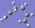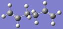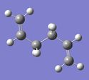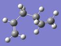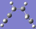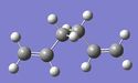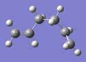 Gauche and antiperiplanar conformations correspond to staggered conformations and hence energy minima, while eclipsed conformations correspond to energy maxima[2]. To compare the relative stabilities of gauche and antiperiplanar conformations, two major effects need to be considered: the effect of stabilising σ C-H / σ* C-H and σ C-C / σ* C-C orbital interactions and the Pauli repulsion energy [2] which both favour the antiperiplanar conformation in the case of n-butane, for example (as a result n-butane shows a difference of energy of -0.8 kcal/mol between the anti and gauche forms[3]). In the gauche form, proximal hydrogens are seperated by 2.35 A [3], in the case of n-butane, while vinyl hydrogens are seperated by 2.5 A[3], in the case of 1,5-hexadiene. Therefore, in the case 1,5-hexadiene, hydrogen atoms are not so close to each other, so repulsive steric interactions should be reduced and hence the gauche and anti conformations should be comparable in terms of stability[3]. To test the veracity of this theory, some gauche conformers were examined: a molecule of 1,5-hexadiene with a 'gauche' linkage for the four central carbon atoms was created and optimised using the Hartree Fock method and a 3-21G basis set. It was then was symmetrised; this gave the C1point group.