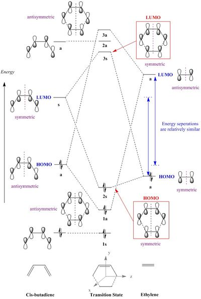 As shown by the different GaussiView snapshots, the HOMO of cis-butadiene and the LUMO of ethylene butadiene are both antisymmetric, while the LUMO of cis-butadiene and the HOMO of ethylene are both symmetric, with respect to a reflection plane bisecting the two central carbon of cis-butadiene. In theory, both sets of MOs could thus overlap and drive the reaction, as illustrated in the MO diagram here below. However, the HOMO of the transition state is symmetric with respect to the plane of symmetry; therefore, the combined orbitals must also be symmetric [4]. Hence, HOMO of the transition state results from the interaction of cis-butadiene’s LUMO with ethylene’s HOMO.